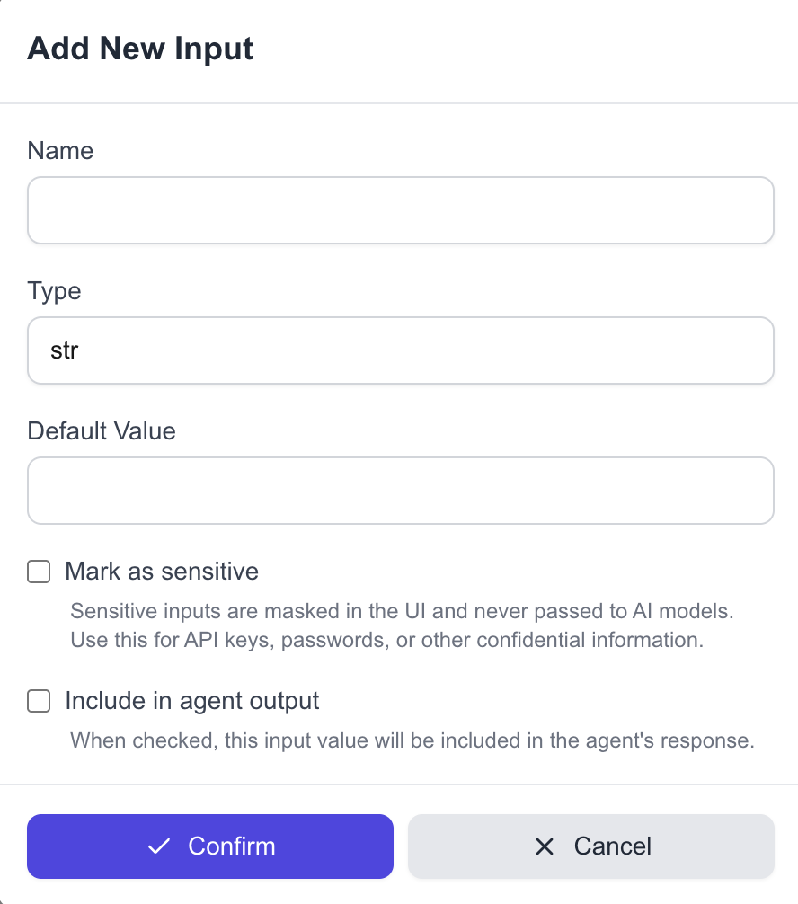 We also support sensitive inputs, such as passwords or API keys. These inputs are:- Masked in the UI